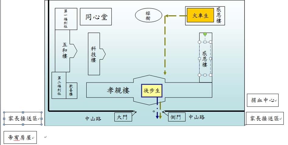 l 家長接送區為捐血中心至970超商及帝宥房屋往德興棒球場方向(如附圖),請家長考量學生上、放學安全,勿在校園周邊接送貴子弟。