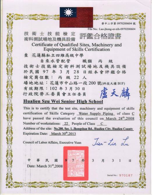 自來水配管職類丙級術科測試場地評鑑合格證書 | ||
